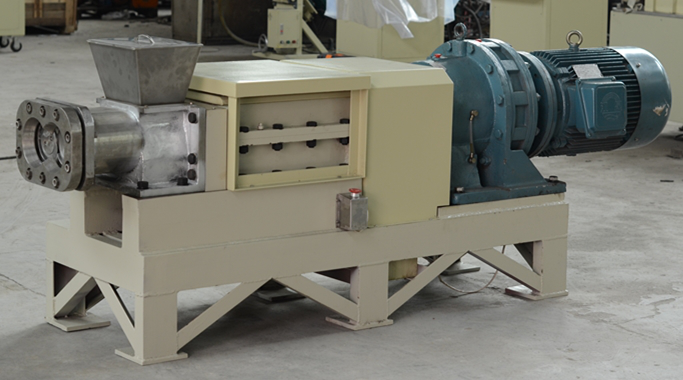 擠出是粉體成型的核心設(shè)備,通過變距螺桿輸送、加壓,將經(jīng)前工序加工后塑性較好的濕料團從擠出筒體前端的模板中擠出,得到截面尺寸形態(tài)一致、表面致密、均勻、光滑的條狀物。整機由兩條突變螺桿、擠出筒體、擠出模板、齒輪箱、密封系統(tǒng)、減速電機、機架和控制裝置等組成。